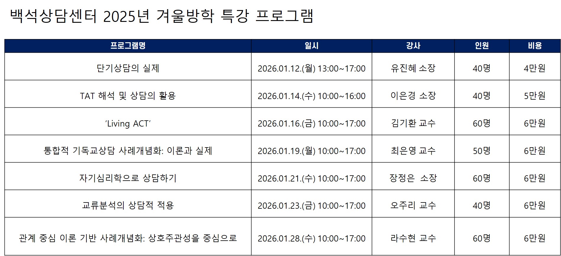 백석상담센터 2025학년도 겨울방학 특강 관련하여 아래와 같이 안내드리오니, 선생님들의 많은 관심과 참여 바랍니다.