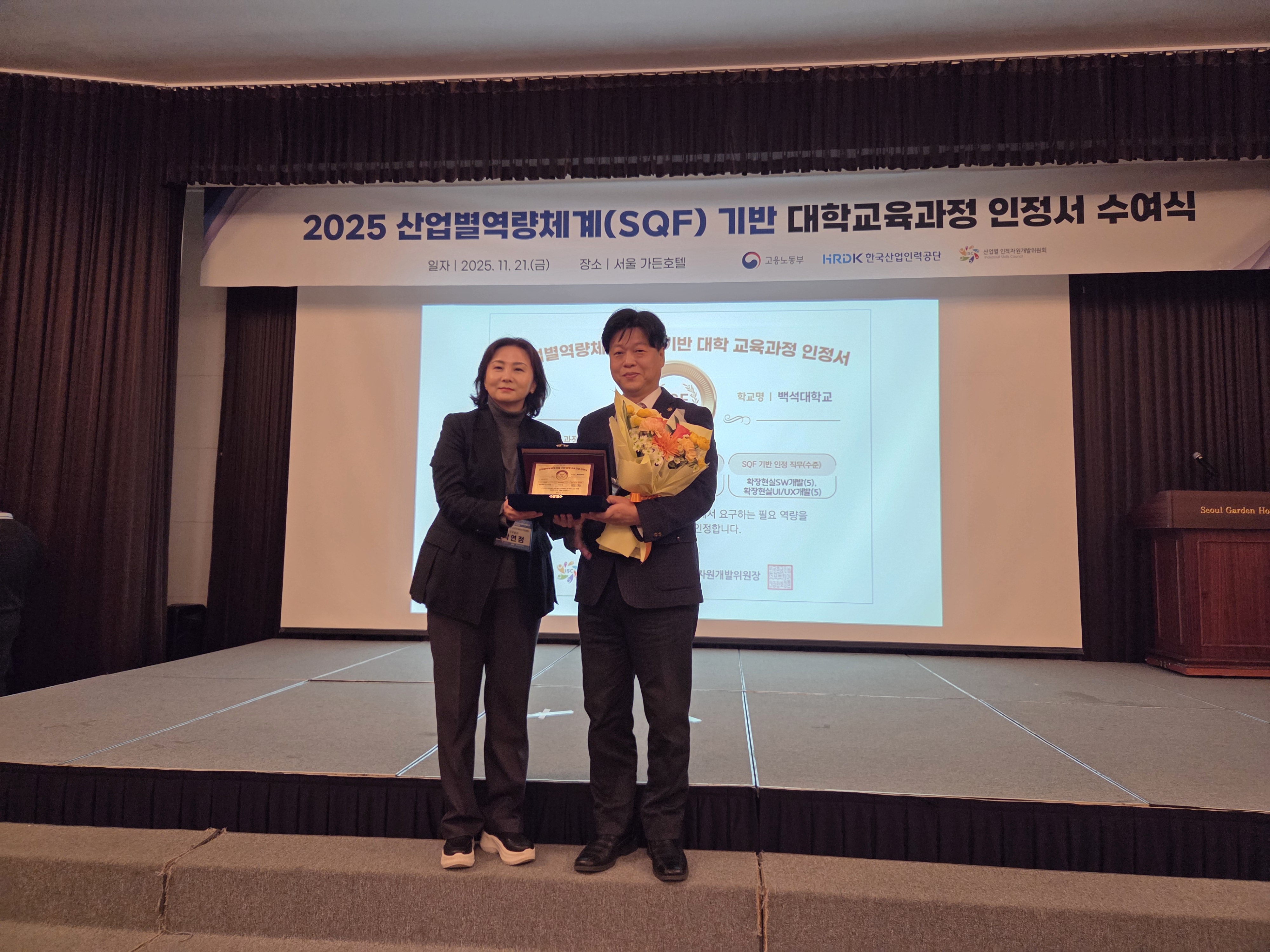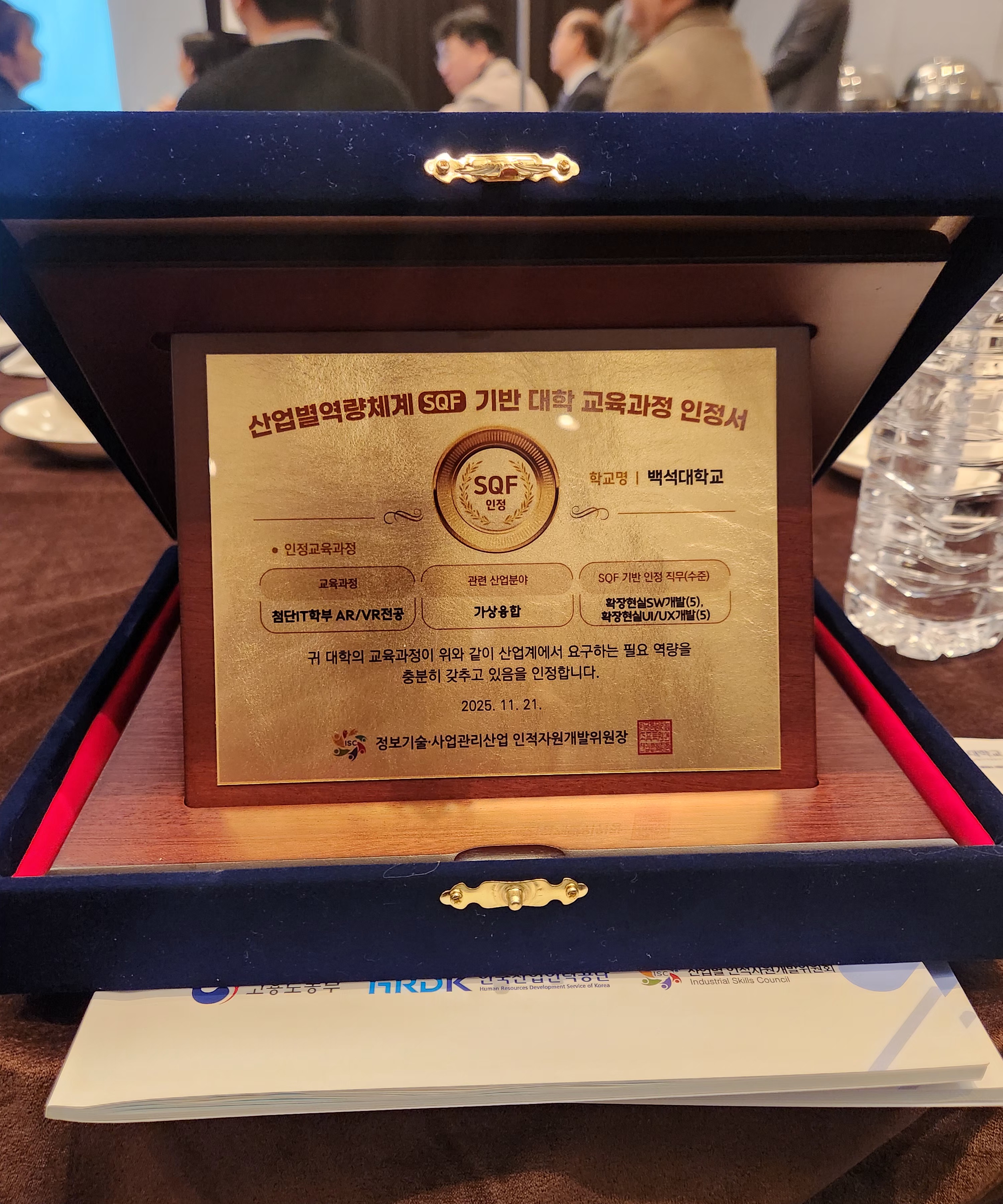 백석대학교(총장 송기신) 첨단IT학부 AR·VR전공이 한국인공지능·소프트웨어산업협회에서 주관하는 2025년 산업별역량체계(SQF) 기반 대학교육과정 인정에서 산업계에서 요구하는 필요 역량을 충분히 갖추고 있는 교육과정으로 인정받아 인정서를 획득했다.