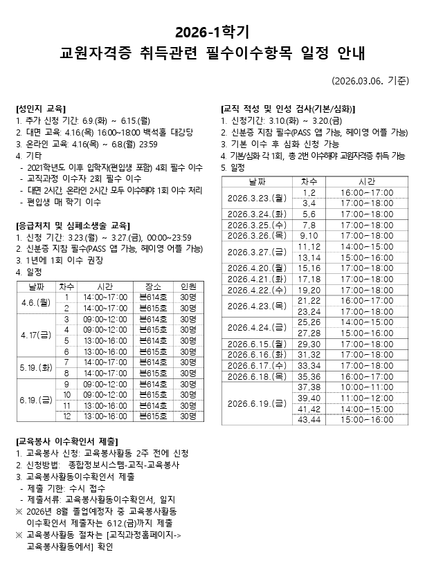 [교직] 2026-1학기 교직이수를 위한 필수 이수 사항 일정 안내(2026.03.06 수정)