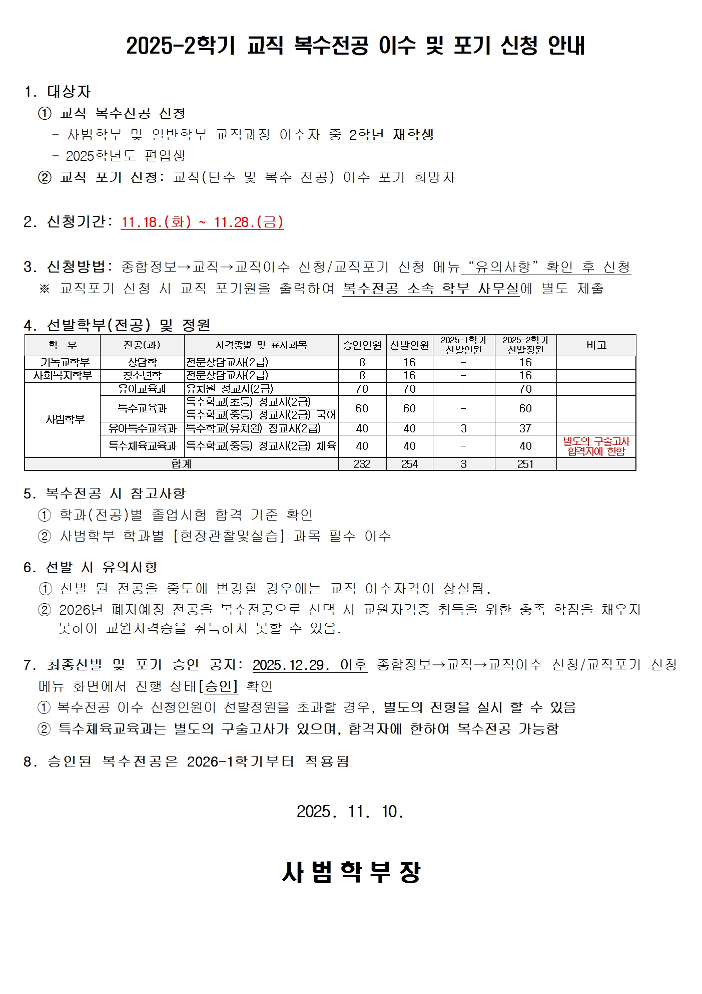 2025-2학기 교직 복수전공 이수 및 포기 신청 안내
