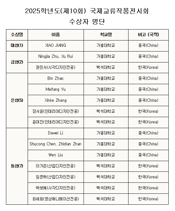 <2025학년도(제10회) 국제교류작품전시회 수상자>