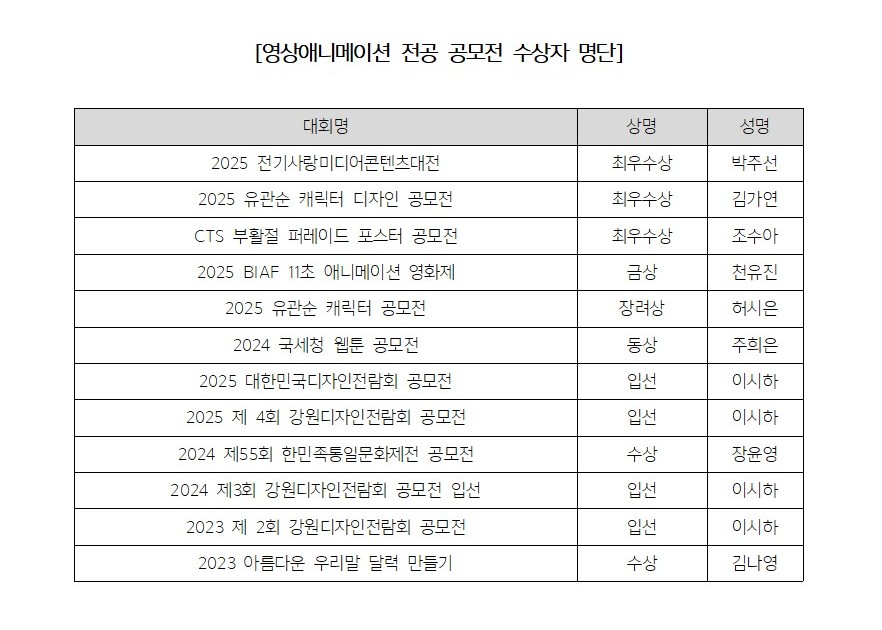 영상애니메이션 전공 공모전 수상 명단
