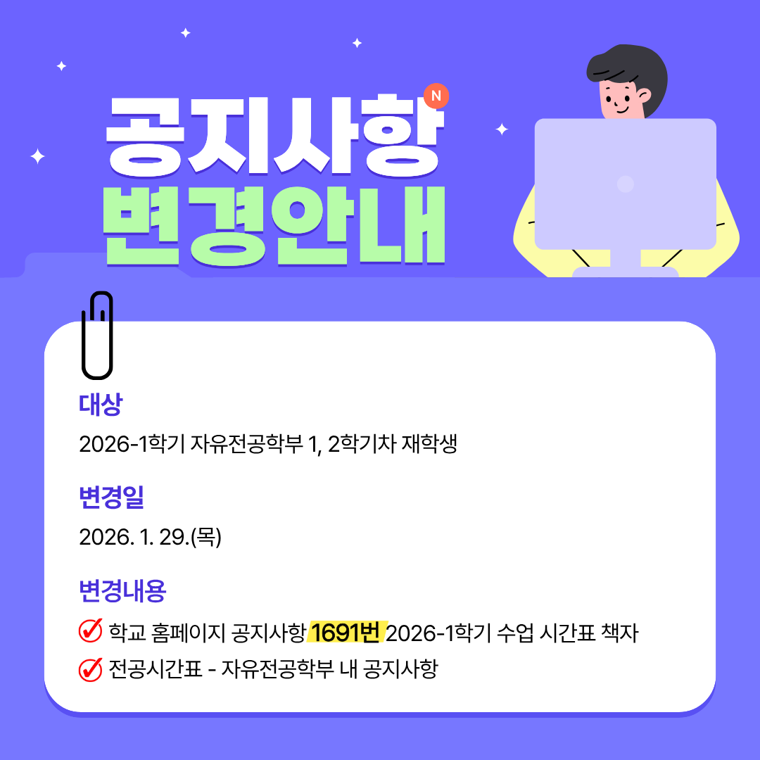 [자유전공학부] 2026-1학기 수업시간표 책자 공지사항 변경 안내