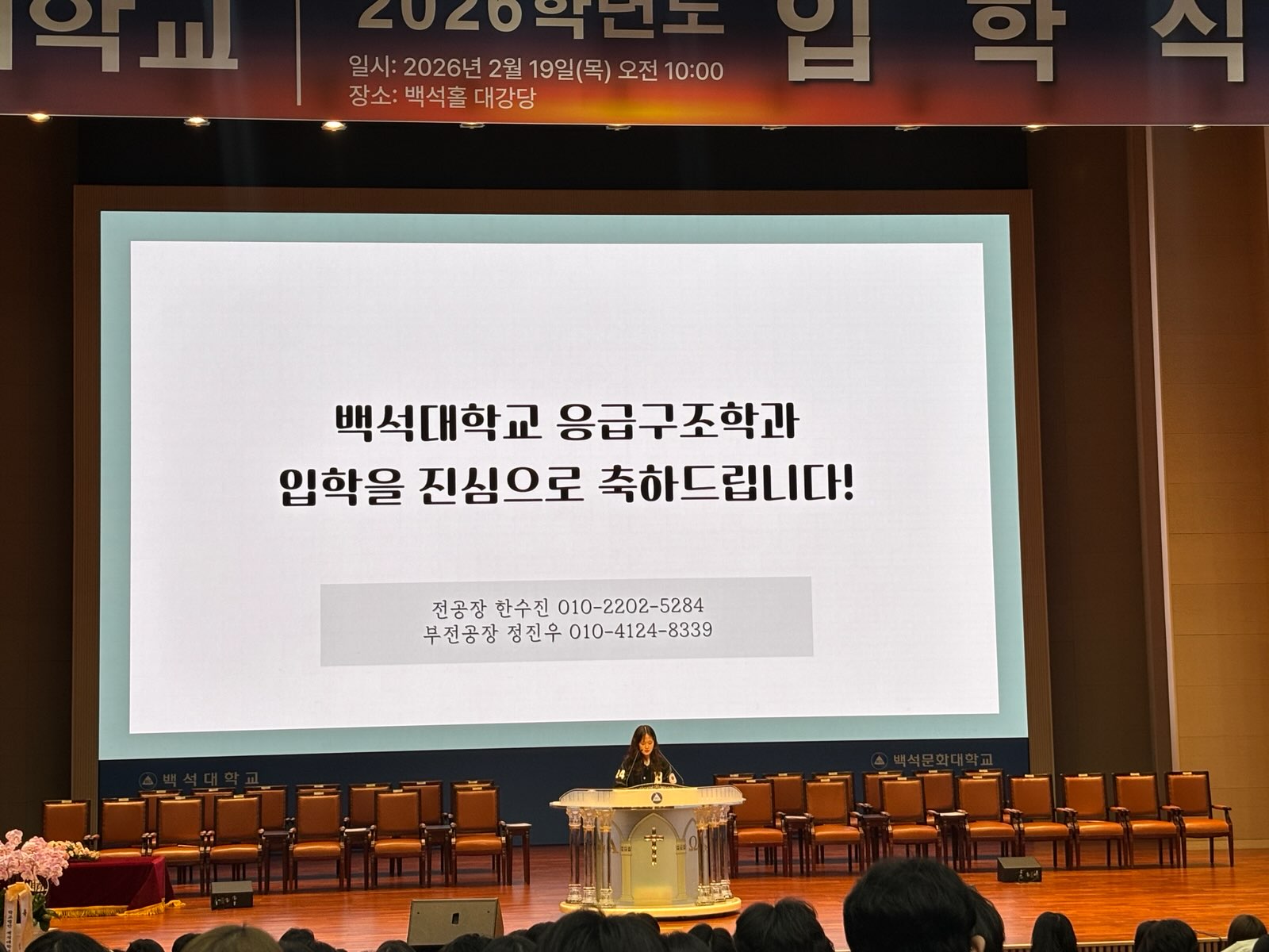 2026년 2월 19일 목요일 오전 11시, 교내 백석홀 대강당에서 ‘2026학년도 입학식을 개최했습니다. "신입생 여러분의 오늘이 미래를 준비하는 가장 값진 시작이 되기를 기대한다"는 총장님의 환영사에 이어 각 학부별로 대학생활 안내 프로그램이 진행되었습니다. 대학생활안내 시간에는 주요 학사제도 소개와 학부 및 전공(과)과 안내, 수강신청 방법 안내 등 신입생들의 대학 적응을 돕기 위한 정보가 제공되었습니다.