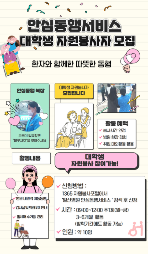 국민건강보험 일산병원에서 안심동행서비스 대학생 자원봉사자를 모집하여 안내드립니다.