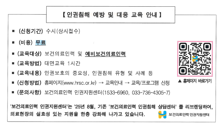 ㅁ 문의사항: 보건의료인력 인권지원센터(1533-6960, 033-736-4305~7)