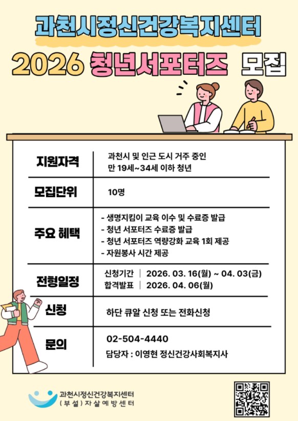 자살 위험 신호를 조기에 인식하고 적절한 대응을 할 수 있도록 역량 강화와 캠페인, 홍보, 온라인 콘텐츠 제작 등 다양한 활동 진행해 사회적 생명존중 분위기 증진을 위해 청년 자살예방 서포터즈를 모집하오니 많은 협조 바랍니다.