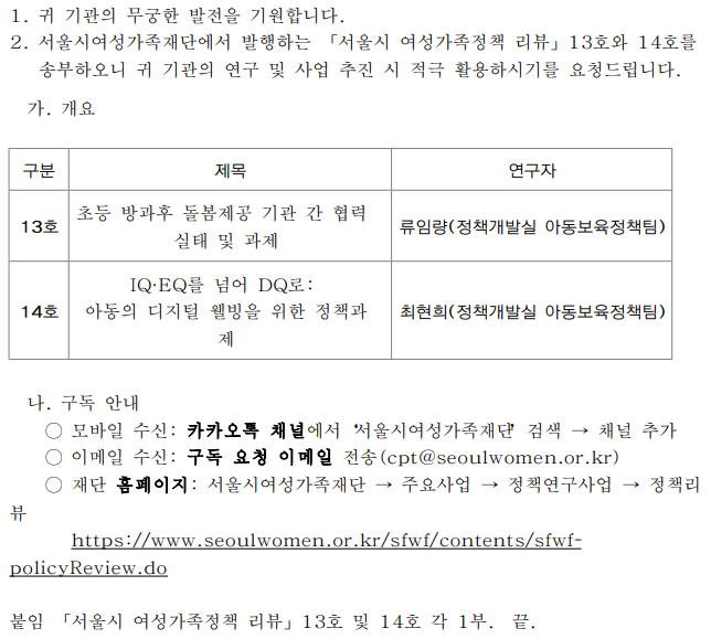[서울특별시여성가족재단] 「서울시 여성가족정책 리뷰」 13호 및 14호 홍보 요청