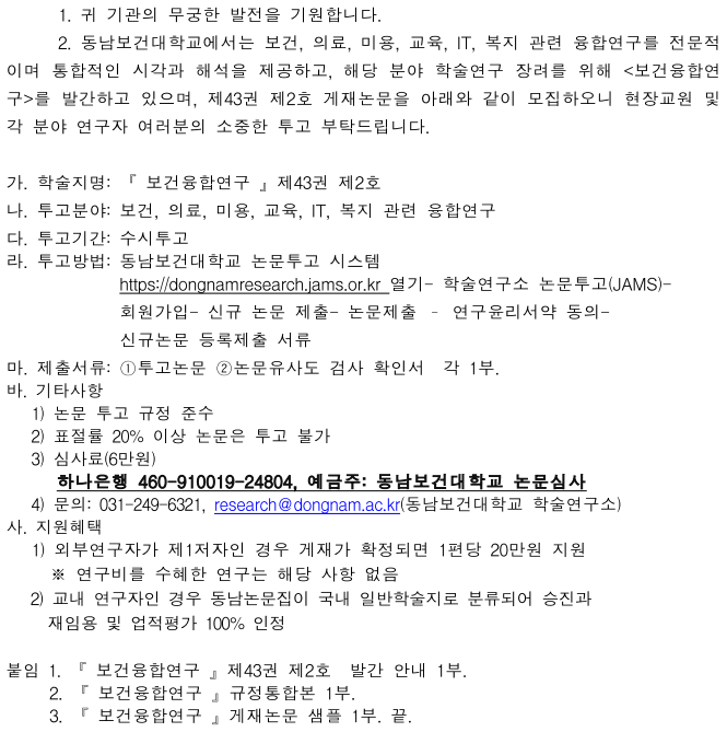 [동남보건대학교] 동남보건대학교 <보건융합연구> 제43권 제2호 논문 모집 안내