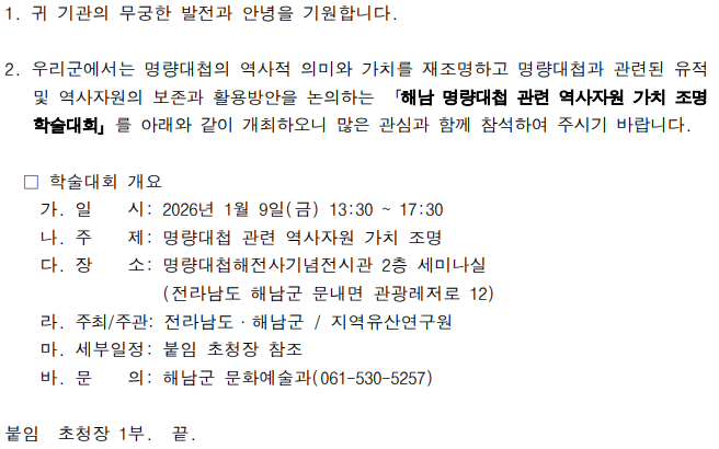 [해남군] 「해남 명량대첩 관련 역사자원 가치 조명」 학술대회 개최 및 참여 안내