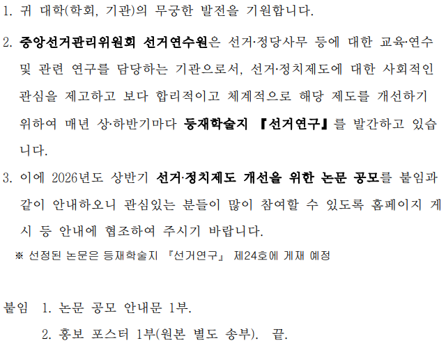 [선거연수원] 2026년 상반기 선거·정치제도 개선을 위한 등재학술지 「선거연구」 논문 공모 안내