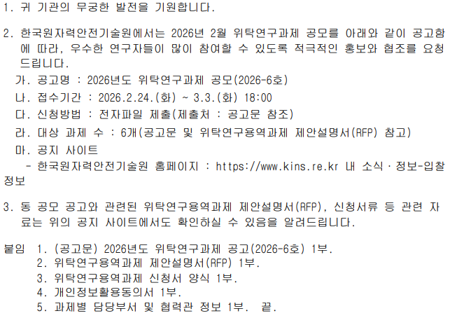 [한국원자력아전기술원] 2026년 2월 위탁연구과제 공모 공고 협조 요청