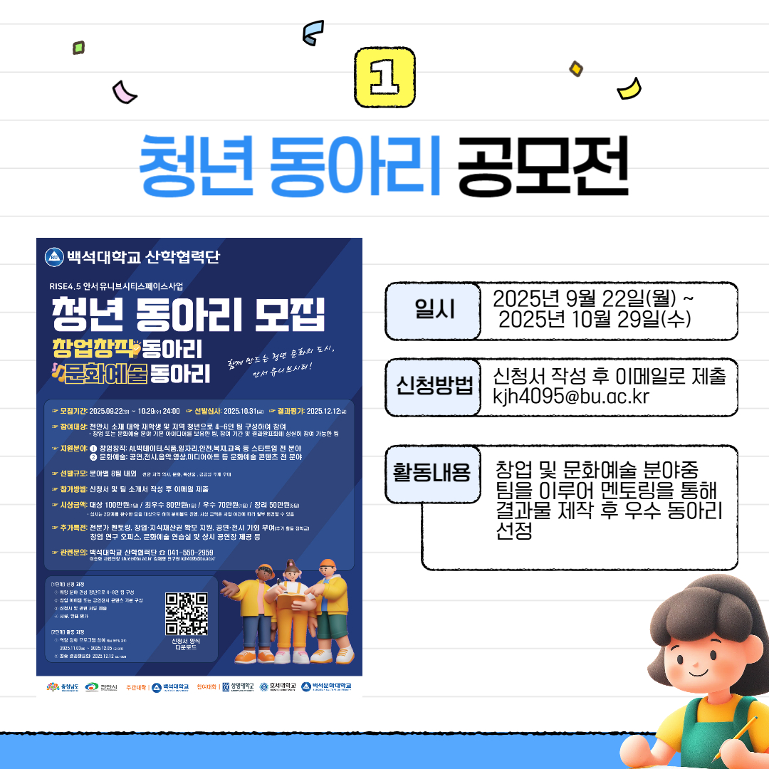 그 과정에서 창업 역량 강화프로그램, 창업 전문가 4인 멘토단 구성, 팀별 멘토링 5회 진행(아이디어 고도화, 사업모델, 재무·마케팅, 지식재산권 등), 오피스 및 공연장등을 지원해준다고 합니다. 신청방법으로는 2025922() ~ 20251029()까지 이메일 kjh4095@bu.ac.kr로 홈페이지내 지원서를 작성하여 지원하시면 됩니다. 참고로 접수는 이메일로만 받기에 유의하시기 바랍니다. 추가 문의는 백석대학교 산학협력단 - 안서 유니브 스페이스 사업 (041-550-2480)로 문의하시기 바랍니다.
