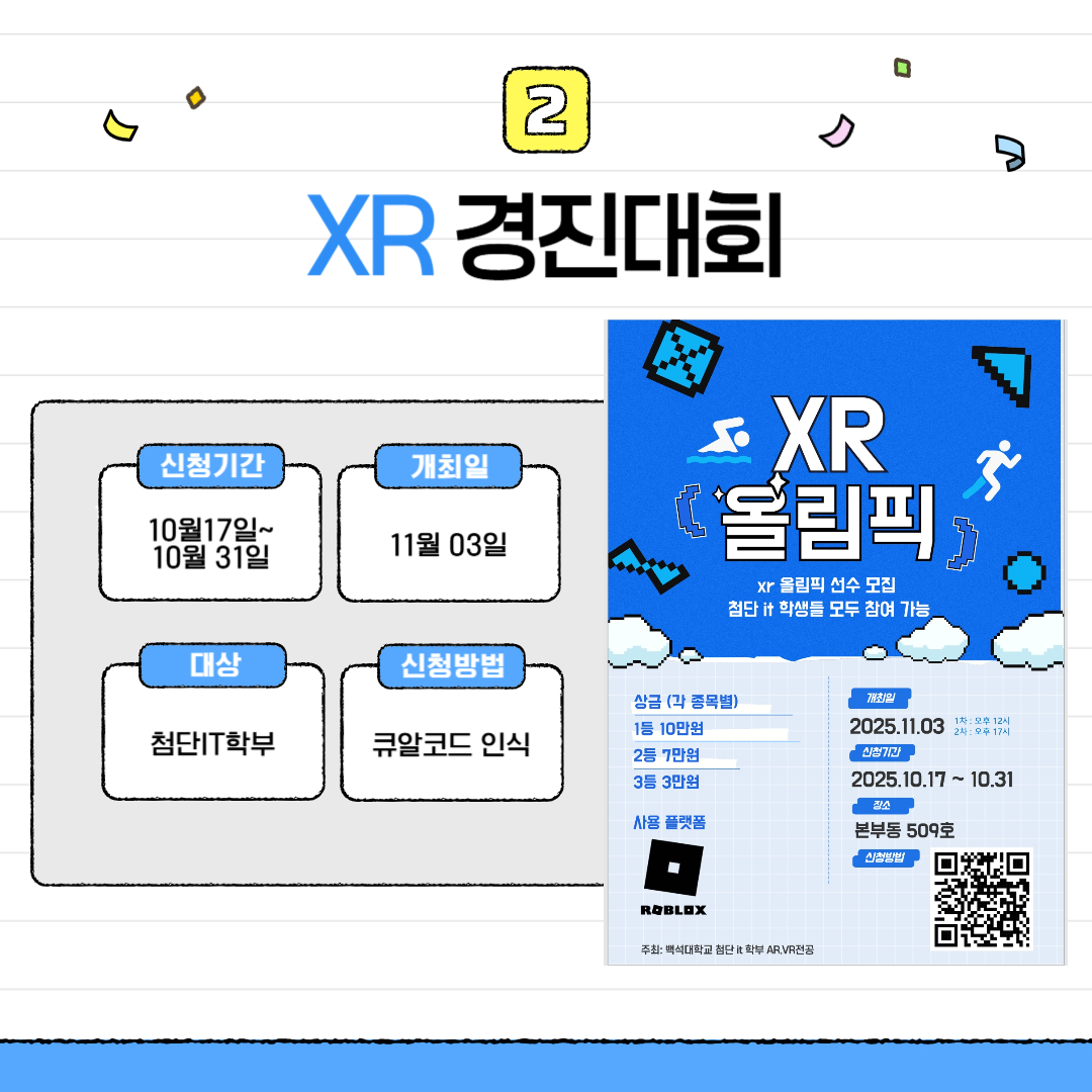 다음으로는 XR올림픽입니다. 이미 올해 5월에 XR경진대회를 진행했었는데요, 이번엔 XR올림픽이라고 합니다. 이번 XR올림픽은 참여만해도 BU포인트 150점이 제공된다니 많은 참여 바랍니다. 이는 첨단IT학과에서 주최하는 공모전으로 첨단IT학우분들만 참여 가능합니다. 컴퓨터공학부 학우분들은 참여가 불가능하니 이점 유의해두시길 바랍니다. 일시는 113일에 진행되며 1차 오후 12, 2차 오후 17시로 1,2차에 나누어 진행됩니다. 장소는 본부동 509호에서 진행됩니다. 사용 플랫폼은 로블록스를 사용합니다. 신청방법은 포스터내 큐알코드를 인식하여 신청하시면 됩니다. 포스터는 본부동 및 학교내 다양한 곳에 부착되어 있으니 참고하시기 바랍니다.