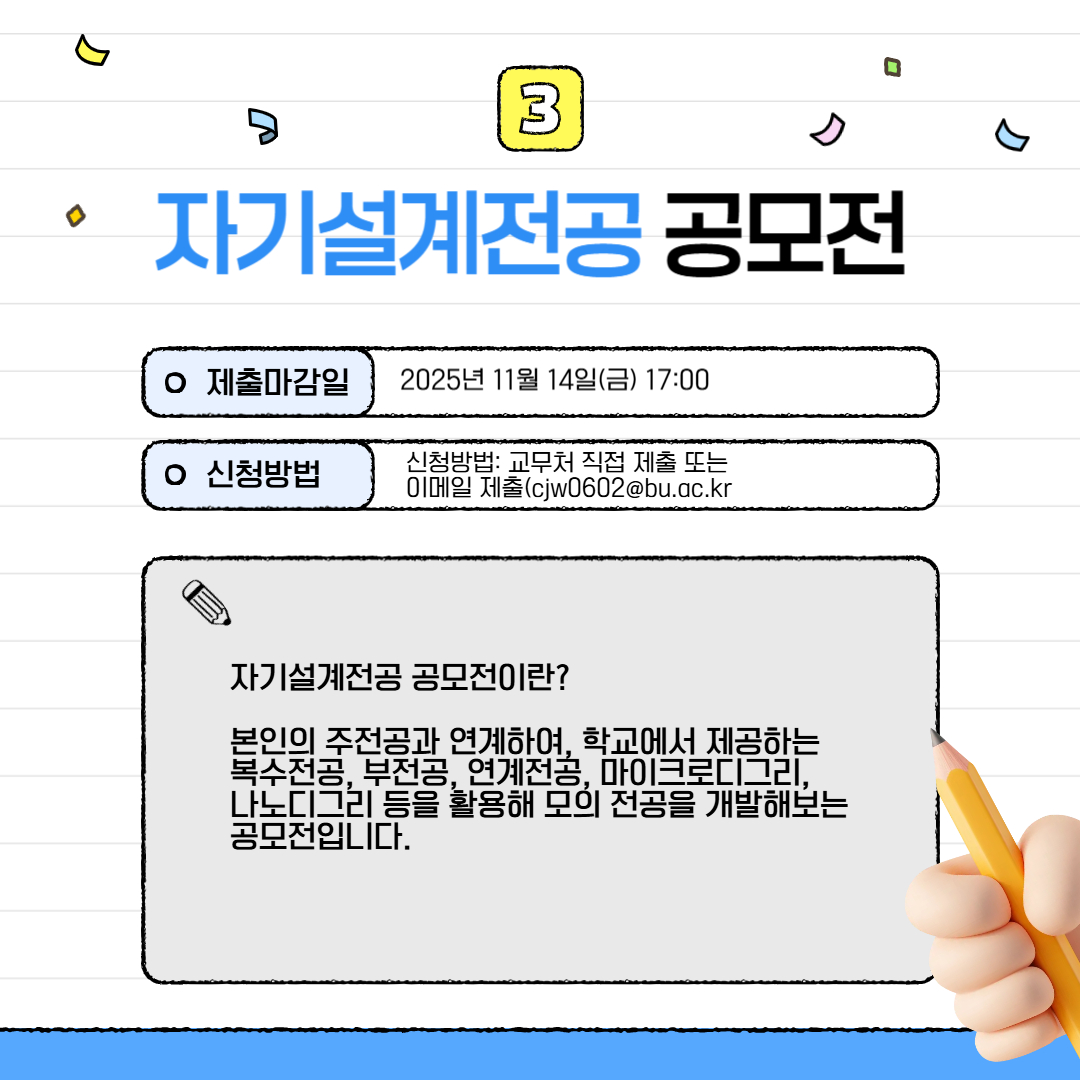 그렇다면 자기설계전공 공모전이란 본인의 주전공과 연계하여, 학교에서 제공하는 복수전공, 부전공, 연계전공, 마이크로디그리, 나노디그리 등을 활용해 모의 전공을 개발해보는 공모전입니다. 자기설계 전공을 혼자 진행하기 어려운 경우에는, 전공 지도교수님과의 1:1상담을 통해 기획방향을 설정할 수 있습니다. 제출일은 20251114() 17:00까지로 참가 신청서, 자기설계 전공 계획서 각 1부를 교무처 직접 제출 또는 이메일 제출(cjw0602@bu.ac.kr)로 제출하시면 됩니다. 신청서 및 계획서는 홈페이지내 파일이 첨부되어 있으니 참고하시기 바랍니다. 시상금은 대상(1): 800,000, 최우수상(2): 600,000, 우수상(3): 400,000, 장려상(4): 100,000[3,600,000]이 주어질 예정이니 많은 참가 부탁드립니다.