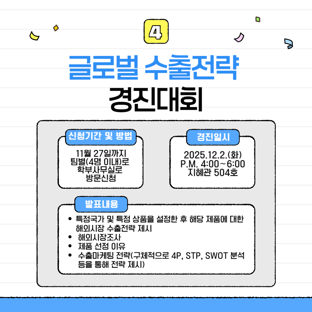 신청 방법은 20251127()까지 팀별(4명 이내)로 학부사무실로 방문 신청하시면 됩니다. 경진대회 일시 및 장소는 20251202일에 오후 4시부터 6시까지 지혜관 504호에서 진행될 예정입니다. 결과 발표는 2025.12.9.()에 진행될 예정이며, 성적우수팀(최우수 1, 우수 2, 장려 3)에게 온라인으로 시상금 통장 입금(총 상금 금액 650,000)된다고 합니다. 또 수상팀별 상장 수여되며, 단순 상금뿐만 아니라 수상자는 국제무역학 전공 졸업시험 면제된다고 하니 많은 분들이 참가하시면 좋을 것 같습니다.