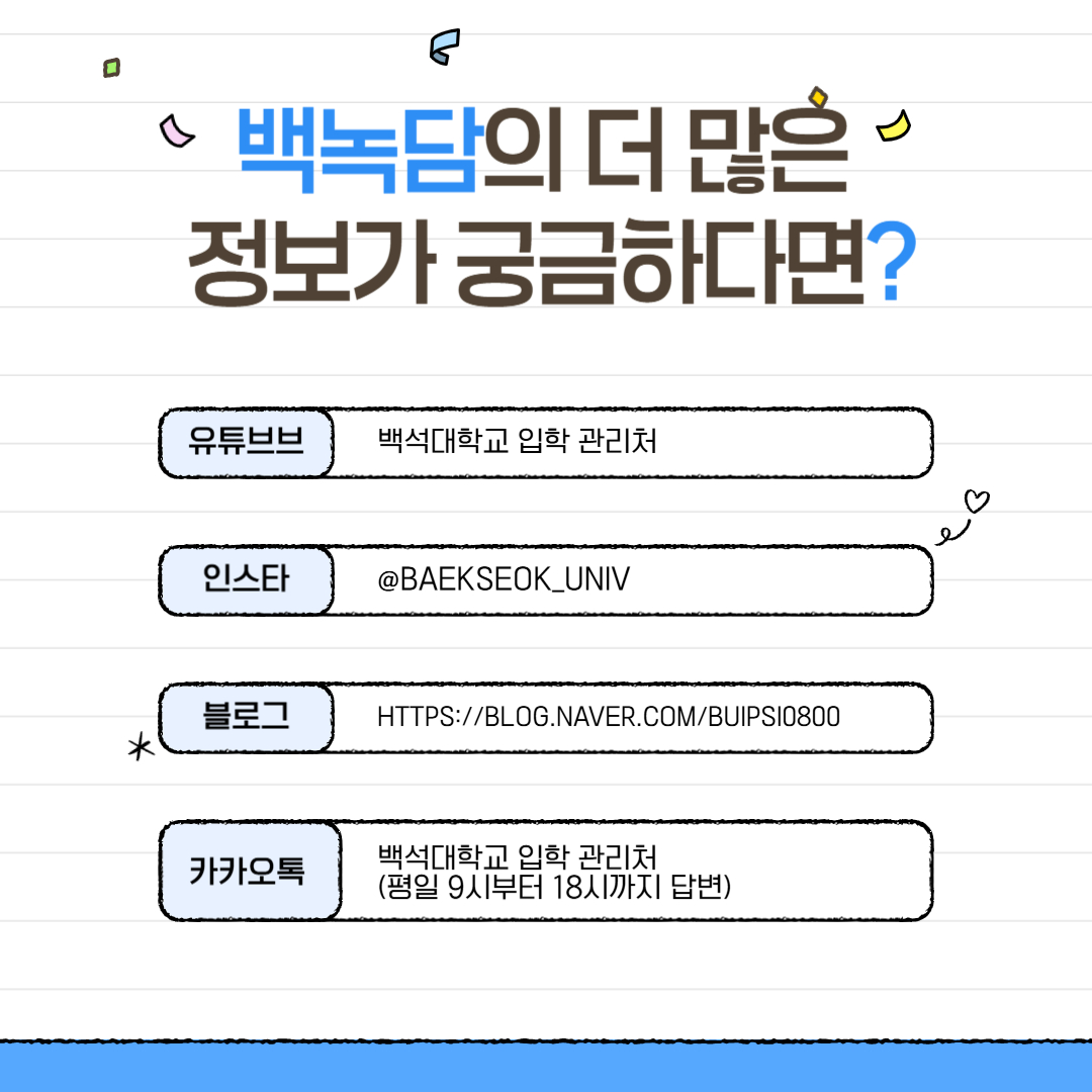 카카오톡 – 백석대학교 입학관리처(평일 9시부터 18시까지 답변)
