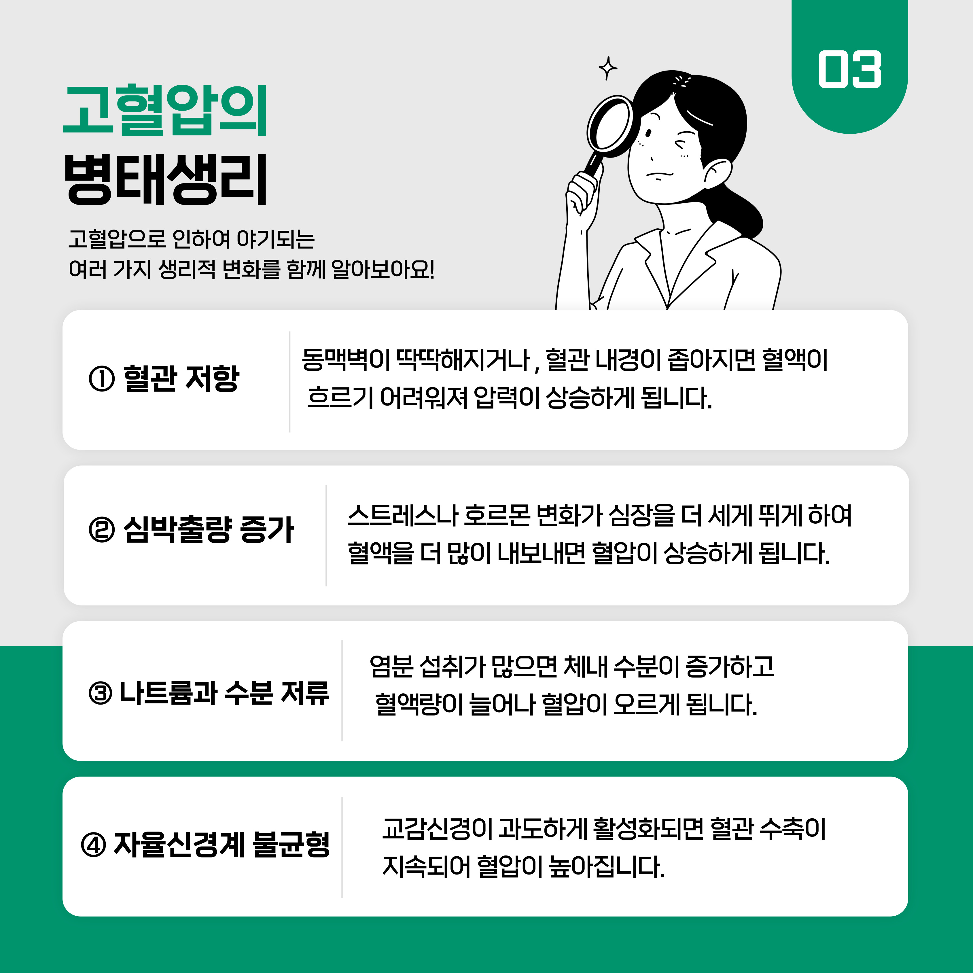 고혈압은 여러 요인들이 복합적으로 작용하여 혈압이 점차 상승하는 질환입니다. 먼저 유전적 요인이 중요한 영향을 미치는데, 가족 중 고혈압 환자가 있는 경우 그렇지 않은 사람보다 혈압이 높아질 가능성이 더 높습니다. 그리고 고혈압엔 생활습관이 큰 비중으로 작용합니다. 특히 고염식은 체내의 나트륨과 수분을 증가시켜 혈액량을 늘리고, 이로 인해 혈압이 상승하기 쉽다. 또한 과체중과 비만은 혈관에 부담을 주고 인슐린 저항성과 내장지방 증가를 유발하여 혈압을 더욱 높이는 주요 요인으로 알려져 있습니다.
