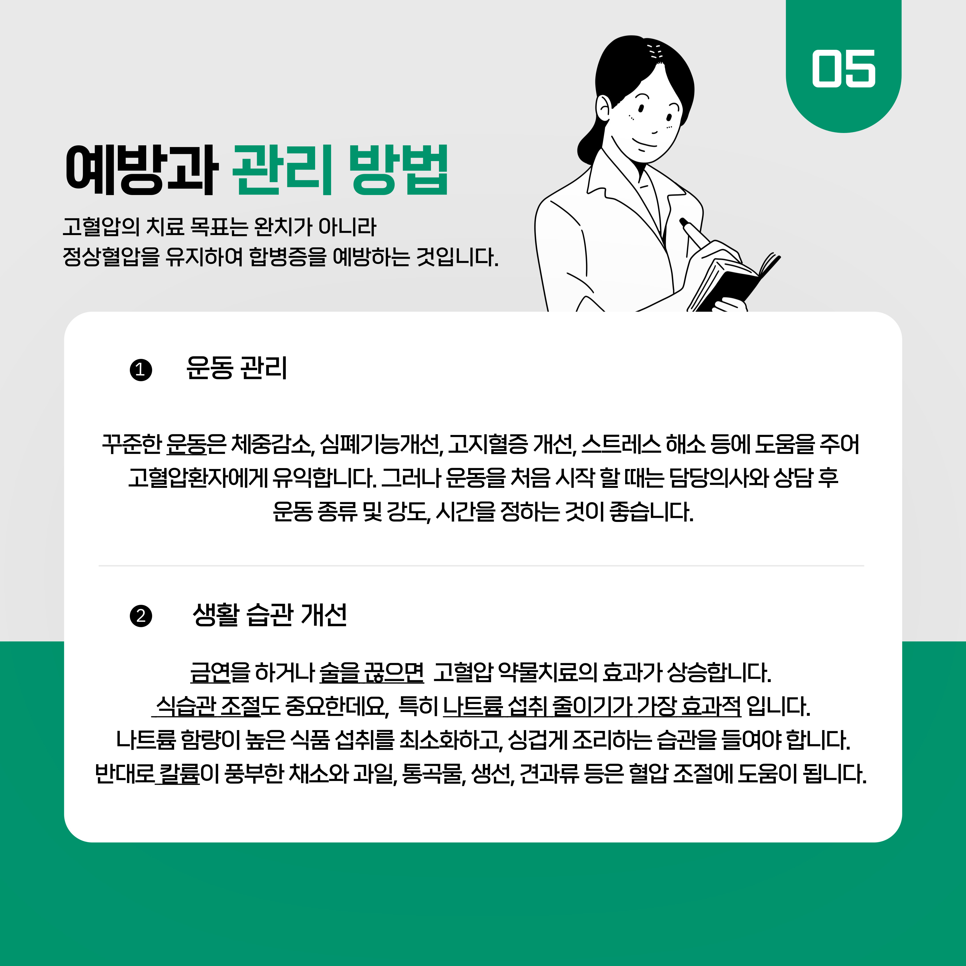 금연을 실천하는 것이 좋습니다. 담배를 끊으면 고혈압 약물치료의 효과가 상승합니다. 술을 끊거나 줄이면 고혈압 약물치료의 효과가 상승하며, 혈압 하강효과는 1~2주 정도면 바로 나타납니다. 고혈압을 관리하고 예방하기 위해서는 약물 치료뿐 아니라 생활습관의 꾸준한 개선이 핵심입니다. 먼저, 식습관 조절이 중요합니다. 특히 나트륨 섭취를 줄이는 것이 가장 효과적인 방법 중 하나로 알려져 있습니다. 국물 위주의 식사, 절임류, 가공식품, 인스턴트 음식은 나트륨이 매우 높기 때문에 섭취를 최소화하고, 싱겁게 조리하는 습관을 들여야 한다. 반대로 칼륨이 풍부한 채소와 과일, 통곡물, 생선, 견과류 등은 혈압 조절에 도움이 됩니다.
