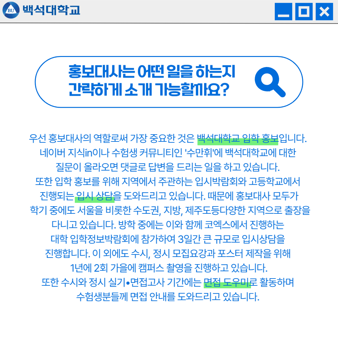 홍보대사: 우선 홍보대사의 역할로써 가장 중요한 것은 백석대학교 입학 홍보입니다. 네이버 지식in이나 수험생 커뮤니티인 '수만휘'에 백석대학교에 대한 질문이 올라오면 댓글로 답변을 드리는 일을 하고 있습니다.