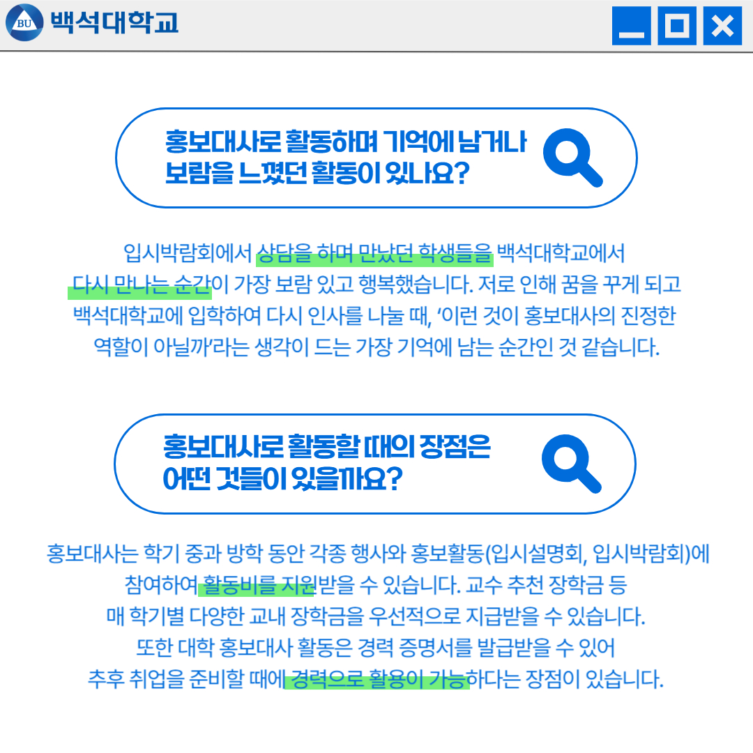 홍보대사: 홍보대사는 학교의 대표로서 교내외에서 큰 역할을 하고 있기 때문에 여러 활동에 책임감과 성실함이 중요하다고 생각합니다. 또한 백석대학교를 희망하는 수험생분들과 학부모님들께 도움을 드릴 수 있도록 학교에 대한 애정과 전공 지식이 많을수록 좋을 것 같습니다.