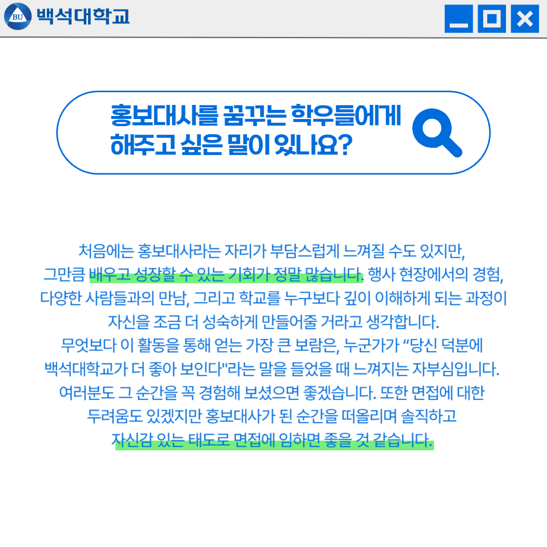 무엇보다 이 활동을 통해 얻는 가장 큰 보람은, 누군가가 “당신 덕분에 백석대학교가 더 좋아 보인다"라는 말을 들었을 때 느껴지는 자부심입니다. 여러분도 그 순간을 꼭 경험해 보셨으면 좋겠습니다. 또한 면접에 대한 두려움도 있겠지만 홍보대사가 된 순간을 떠올리며 솔직하고 자신감 있는 태도로 면접에 임하면 좋을 것 같습니다.