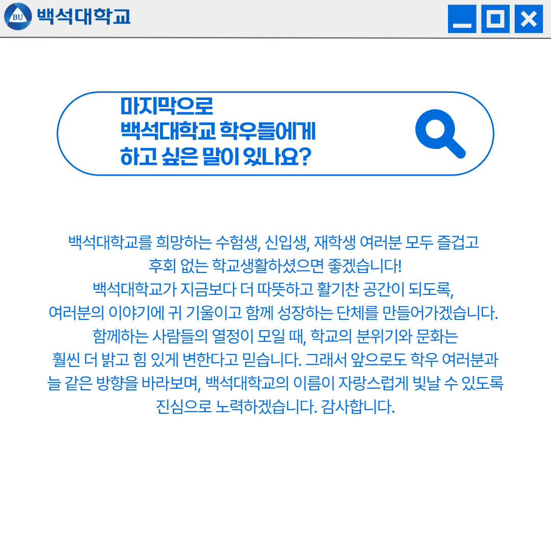 함께하는 사람들의 열정이 모일 때, 학교의 분위기와 문화는 훨씬 더 밝고 힘 있게 변한다고 믿습니다. 그래서 앞으로도 학우 여러분과 늘 같은 방향을 바라보며, 백석대학교의 이름이 자랑스럽게 빛날 수 있도록 진심으로 노력하겠습니다. 감사합니다.