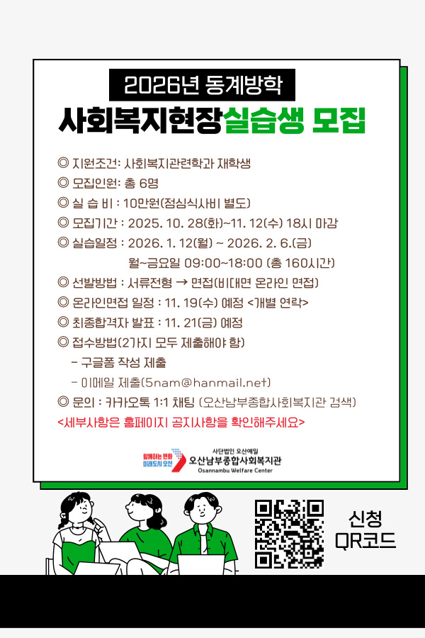 [오산남부종합사회복지관] 2026 동계방학 사회복지현장 실습생 모집