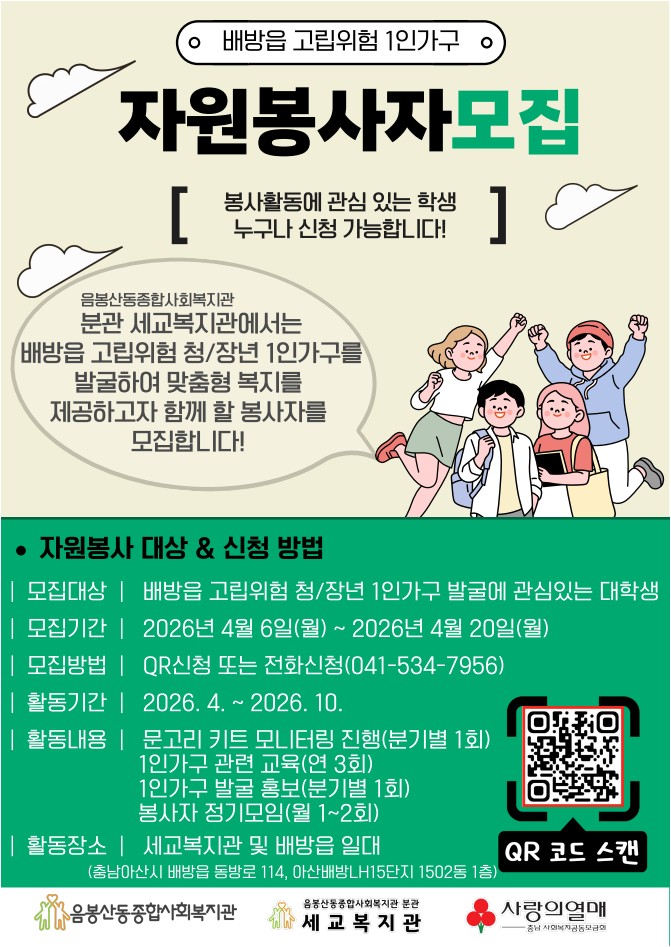 [음봉산동종합사회복지관] 1인가구통합지원사업 자원봉사자 모집