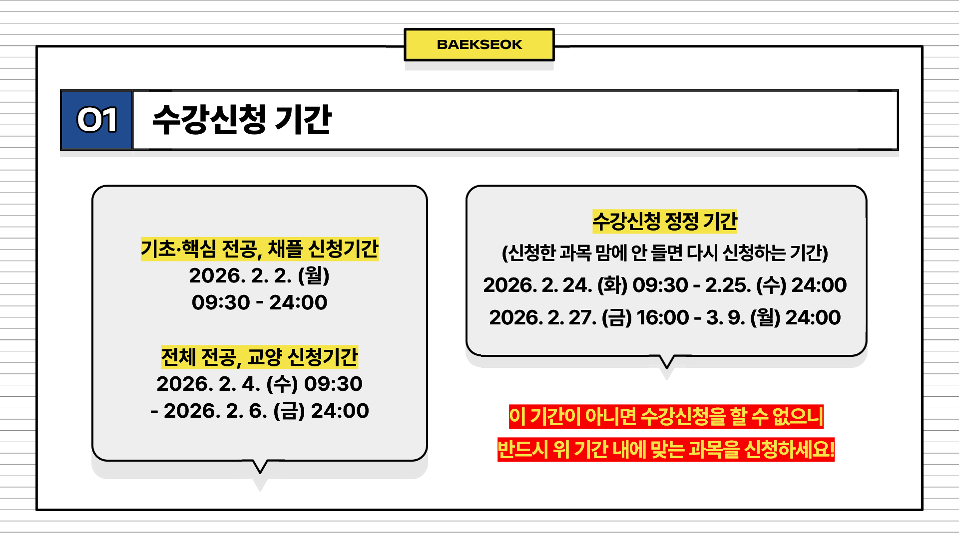 2026. 2. 2. (월)- 2026. 2. 6(금)까지 2026-1학기 수강신청 기간입니다.