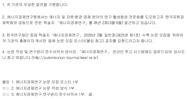 [에너지경제연구원] 등재 학술지「에너지경제연구」 논문 공모 안내 협조 요청